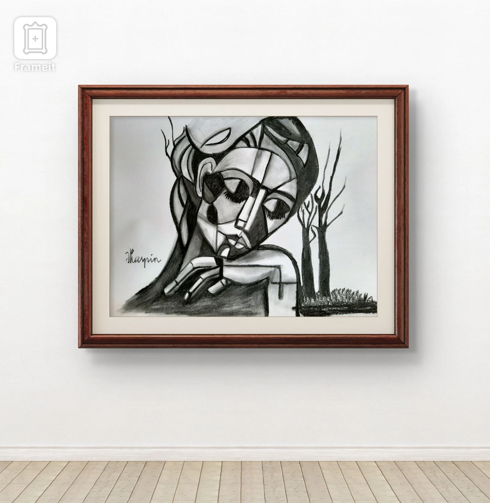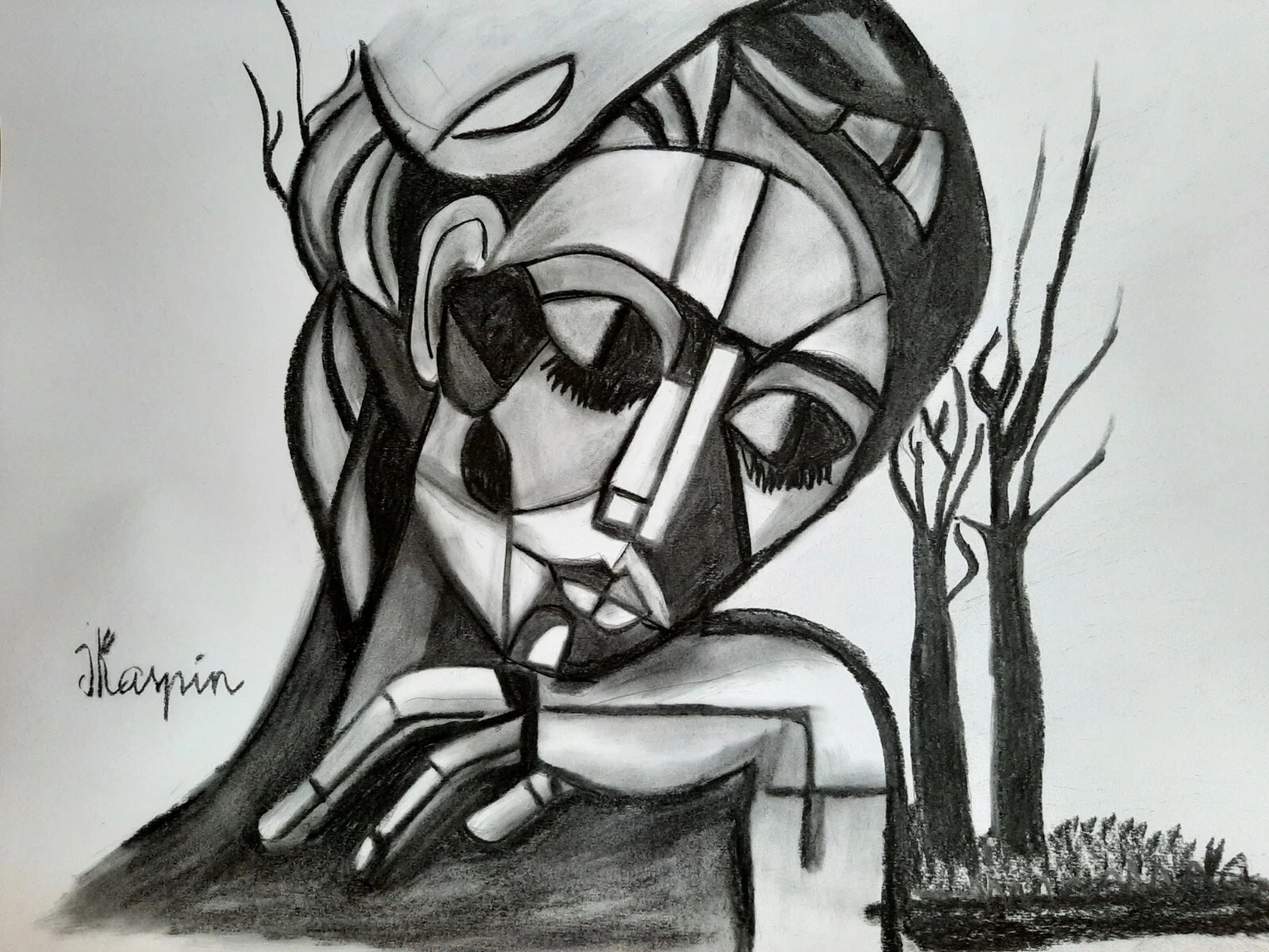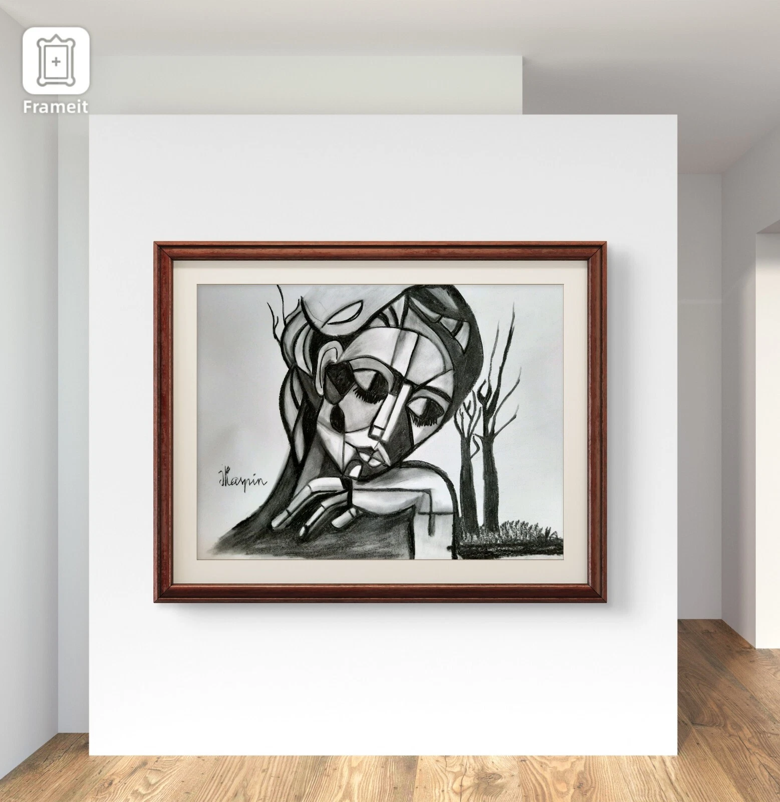 L’œuvre présentée ici — figure stylisée, yeux clos, main posée sur la joue — condense à elle seule la tension entre structure et émotion. Le trait est précis, presque architectural, mais il n’enferme pas : il révèle. Chaque facette du visage semble porter une mémoire, un silence, une pensée en suspens. L’arrière-plan, peuplé d’arbres schématiques et d’herbes esquissées, agit comme un contrepoint organique à la rigueur géométrique du sujet, suggérant un dialogue entre l’humain et le monde, entre l’intériorité et le paysage.