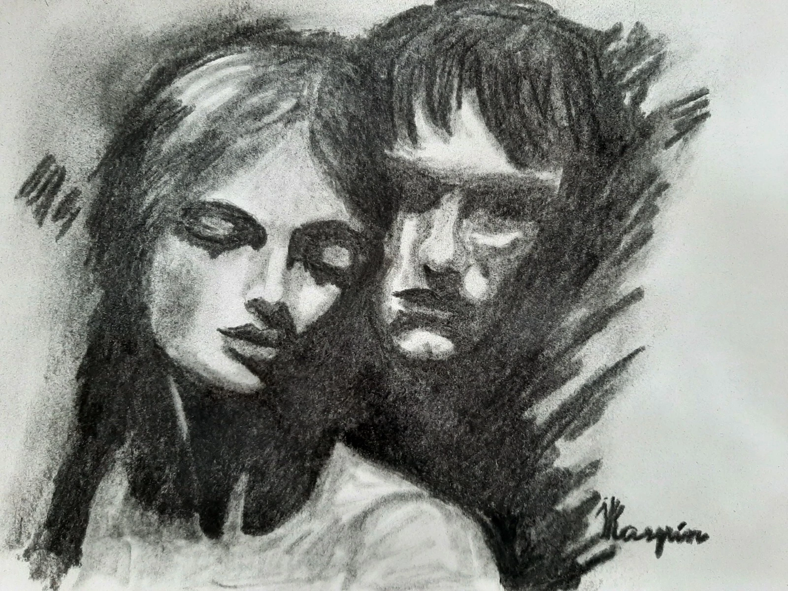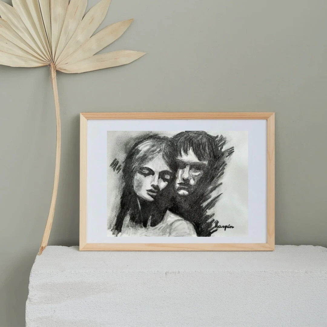 Le contraste entre les expressions, accentué par une technique de dessin audacieuse et expressive, crée une tension poétique. Les ombres profondes, les traits marqués, et le fond abstrait enveloppent les deux figures dans une atmosphère dense, presque suspendue. Ce n’est pas un simple portrait : c’est une scène intérieure, un dialogue muet entre deux âmes.