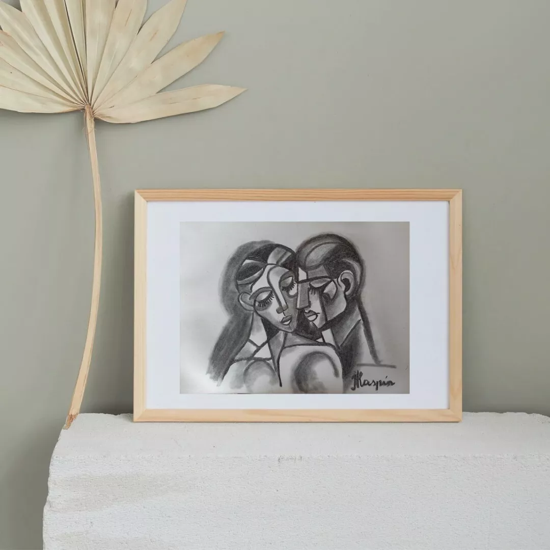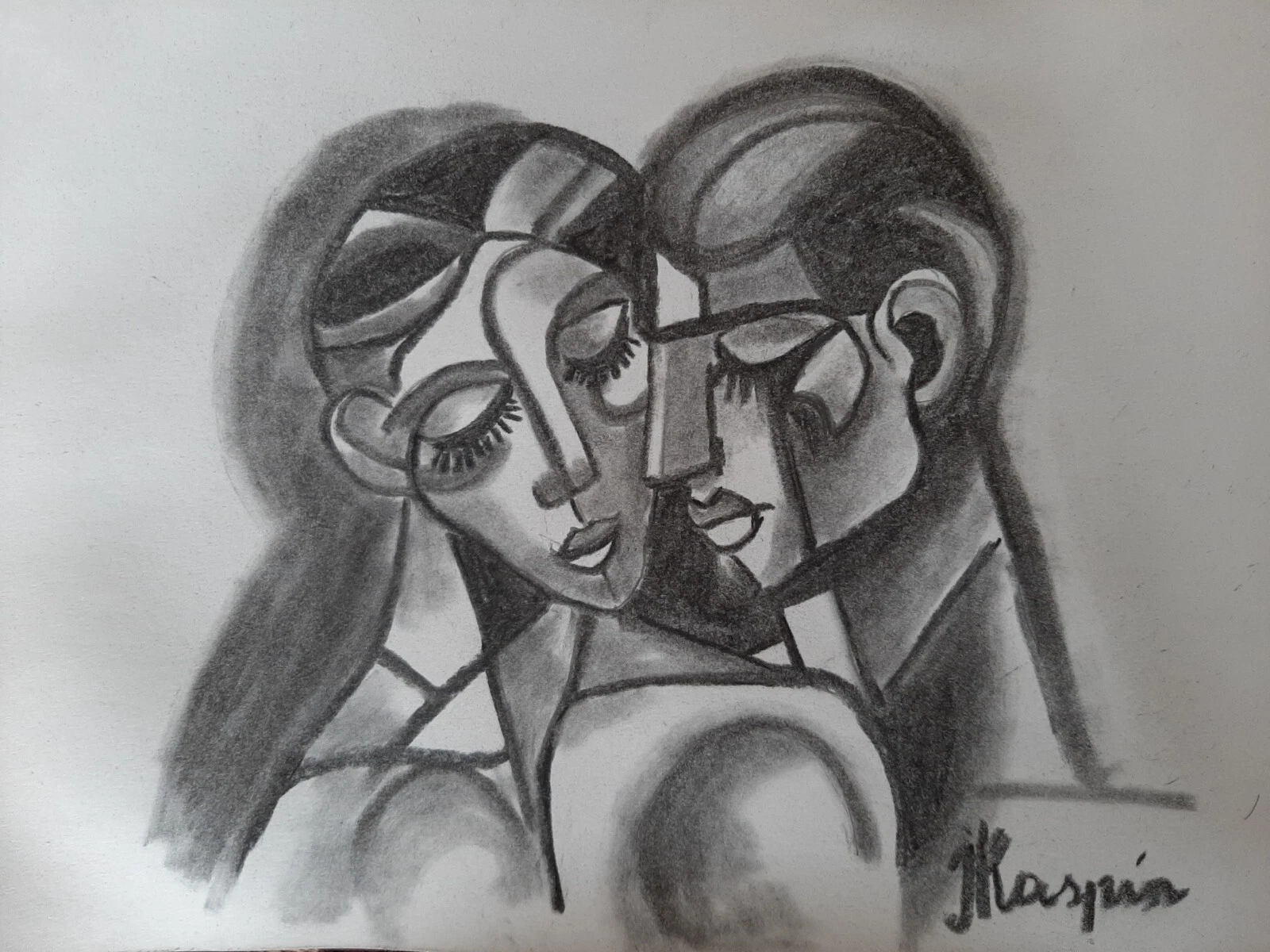 Dans Le Murmure du Cœur, Kaspin Jacques livre une œuvre d’une intensité rare, où la tendresse humaine se fond dans l’abstraction géométrique. Ce dessin au fusain, réalisé sur papier A4, s’inscrit dans une esthétique cubiste revisitée, où les formes fragmentées ne brisent pas l’émotion mais la concentrent.