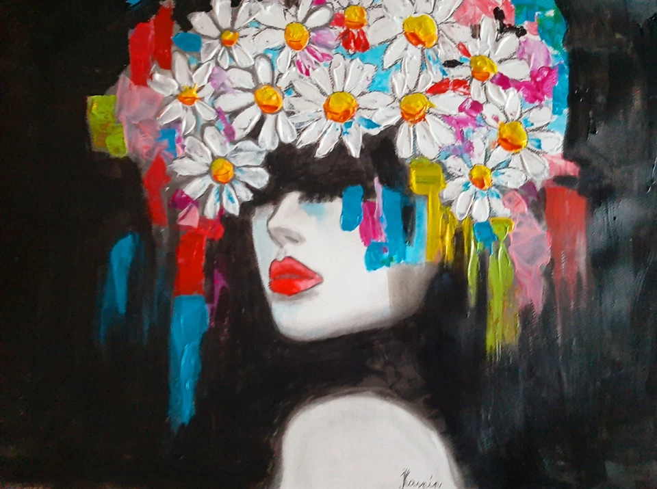 Ce visage féminin, à demi caché, m’a évoqué une présence familière, presque intime. Il y a dans ses traits une retenue, une pudeur, et pourtant une force tranquille. Les marguerites qui l’entourent ne sont pas là pour décorer — elles respirent, elles vivent, elles racontent.