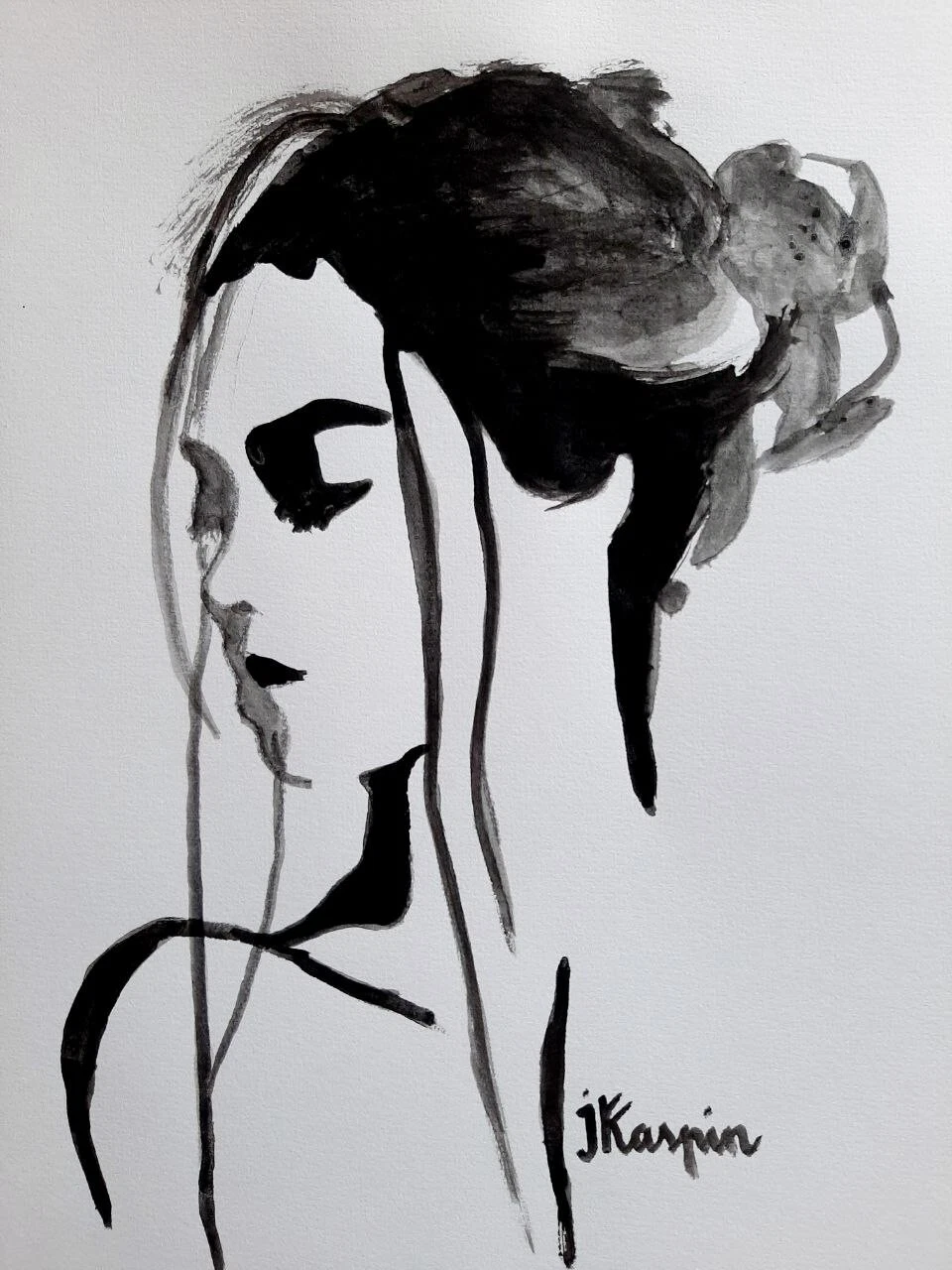 La figure féminine, tracée avec une économie de moyens remarquable, semble flotter entre présence et effacement. Les yeux clos, le profil délicat, les mèches libres : tout dans cette composition évoque une intériorité profonde, un dialogue muet avec l’invisible. L’encre, tantôt dense, tantôt diffuse, épouse les contours sans jamais les enfermer, laissant au blanc du papier le rôle actif de révélateur.