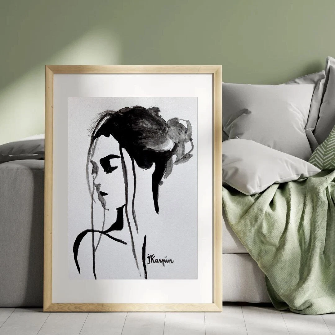 The female figure, rendered with fluid, restrained brushstrokes, appears suspended between presence and disappearance. Her closed eyes, delicate profile, and loosely gathered hair evoke a moment of inward retreat—a dialogue not with the viewer, but with something deeper, more elusive. The ink flows with intention, yet never confines; it allows the white of the paper to breathe, to speak, to hold space.