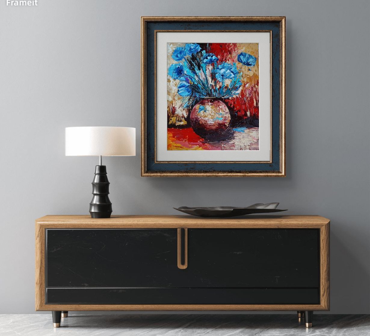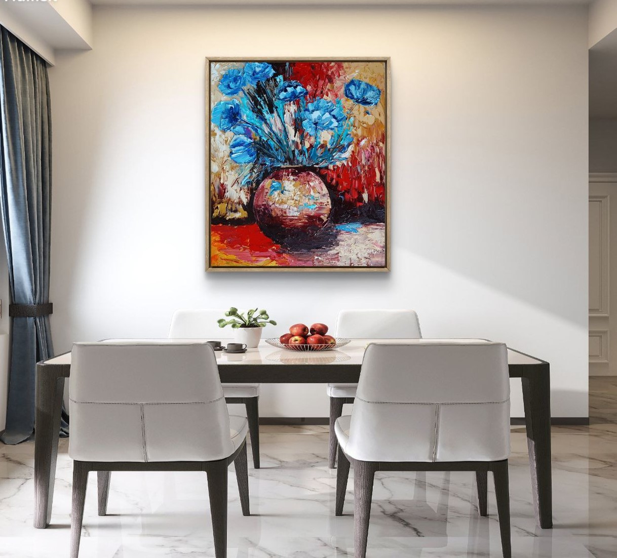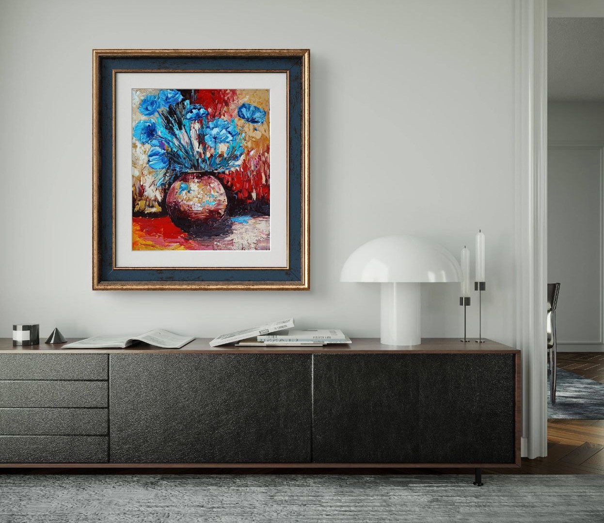 From the chromatic tumult, the blue flowers emerge, at once fragile and radiant. They impose themselves as a central motif, but above all as a symbol: they carry the weight of a gaze, the trace of an absence, the strength of a memory that neither time nor rain has been able to erase. Their blue, of almost infinite depth, dialogues with the incandescent red of loss and the blazing yellow of hope.