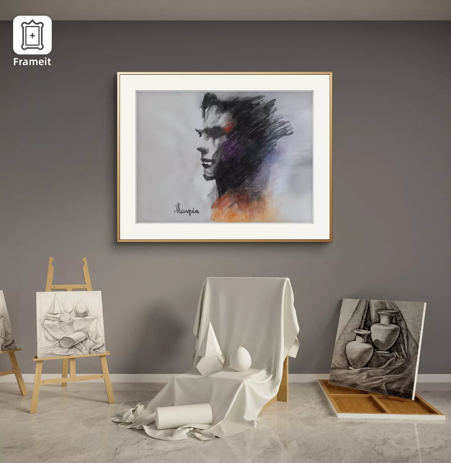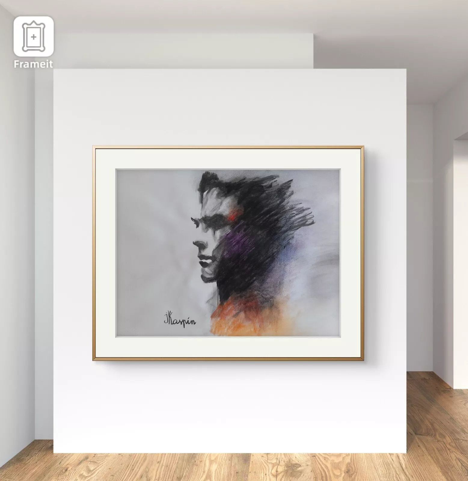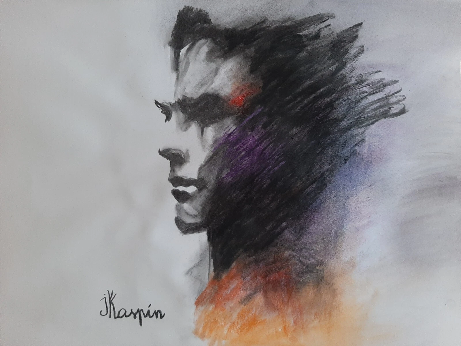The charcoal, raw and tactile, evokes the weight of introspection, the sediment of past seasons. It sculpts the face with a quiet intensity, revealing not just form but inner terrain. Pastel accents—flashes of orange, violet, and red—interrupt the darkness like emotional pulses, suggesting warmth, longing, and the first stirrings of desire. These colors do not decorate; they breathe.