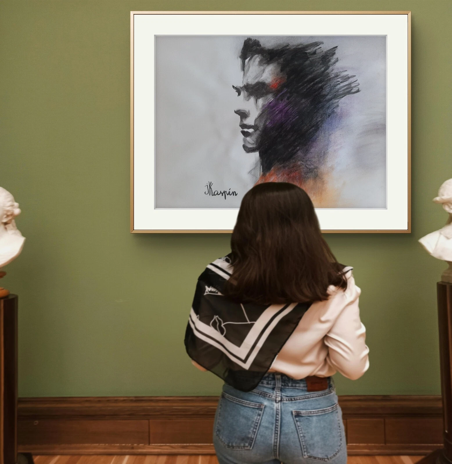 In When Spring Returns, Kaspin Jacques offers a deeply evocative portrait that transcends figuration to become a meditation on time, memory, and emotional renewal. Rendered in charcoal and pastel, the work captures a side profile with expressive force—its contours carved in shadow, its essence suspended between silence and awakening.