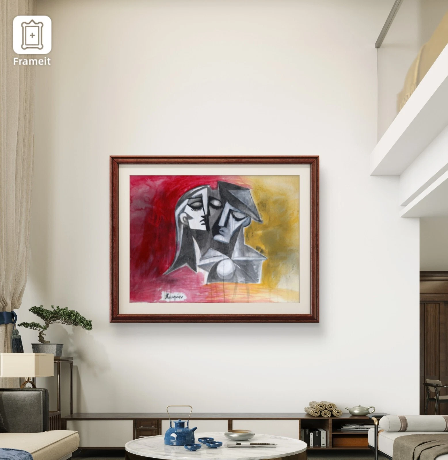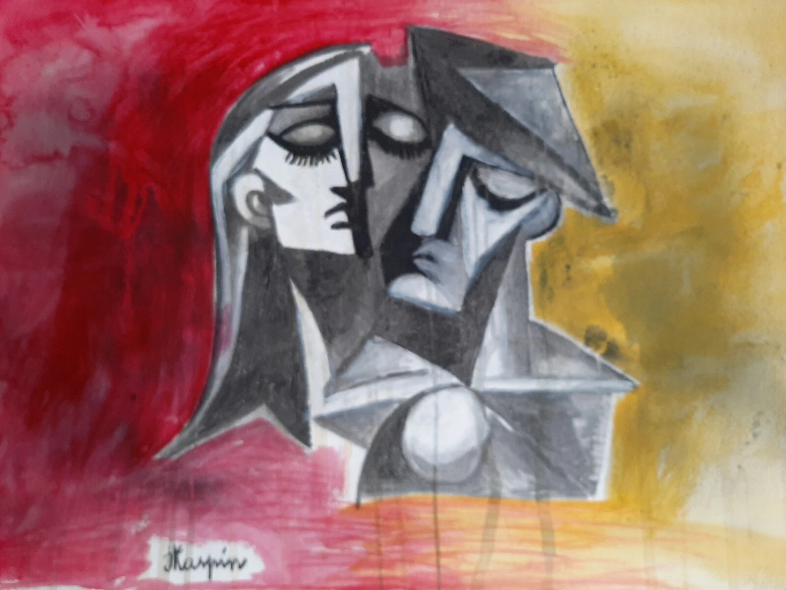 In this striking piece by Kaspin Jacques, tenderness is rendered through the fractured lens of abstraction. Two stylized faces, intertwined in a cubist composition, emerge against a vivid dual-toned backdrop—crimson on one side, golden on the other—suggesting both emotional tension and harmony.