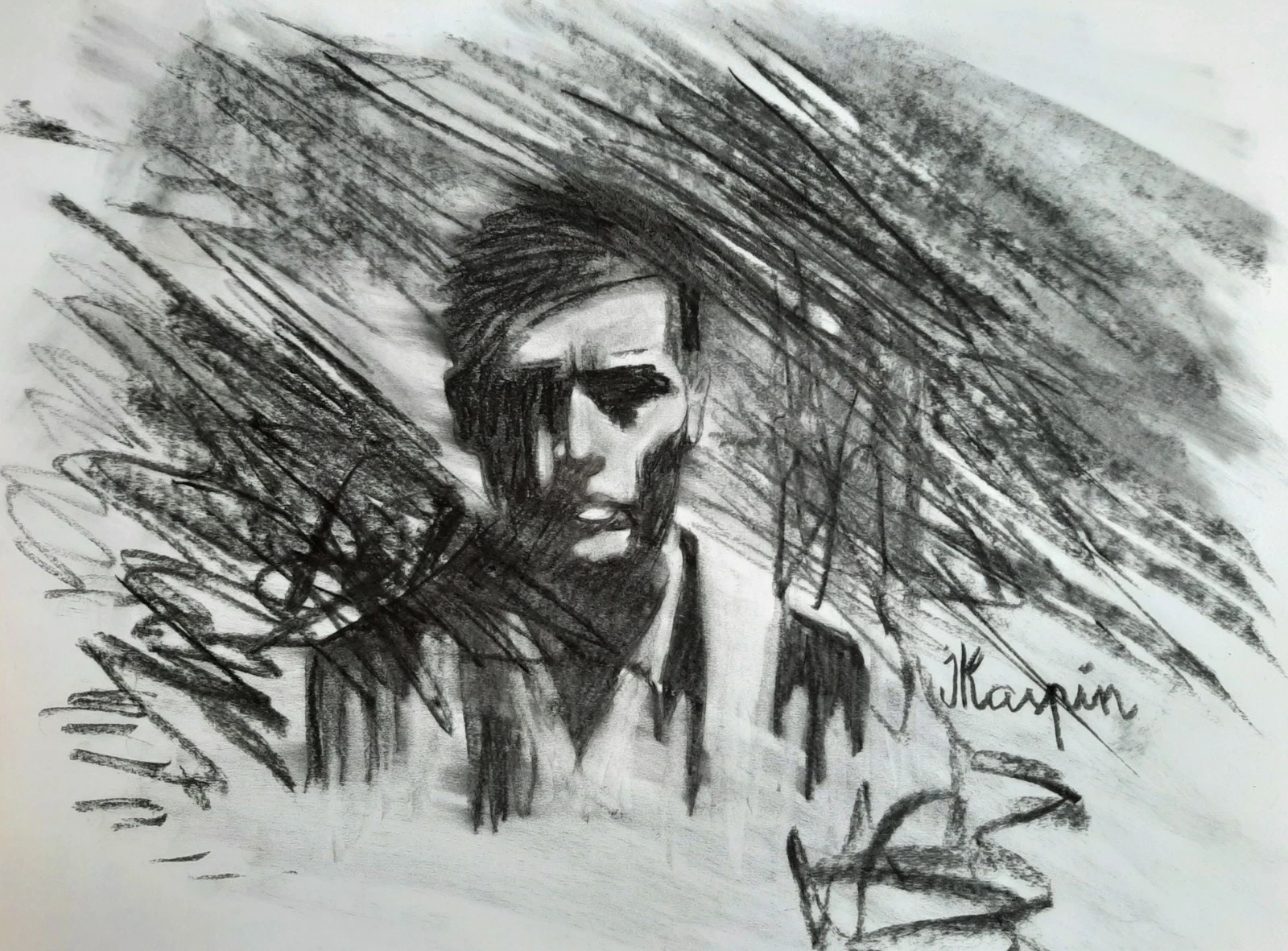 Dans Le manque, Kaspin Jacques livre une œuvre d’une intensité rare, où le trait brut du fusain devient langage, et l’ombre, mémoire. Ce portrait, à la fois frontal et fuyant, nous confronte à une figure humaine dont l’identité semble se dissoudre dans le tumulte du fond. Le visage, partiellement englouti par les ténèbres, n’est pas un effacement : c’est une résistance silencieuse.