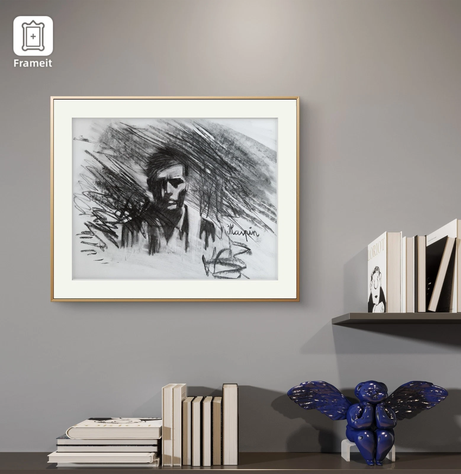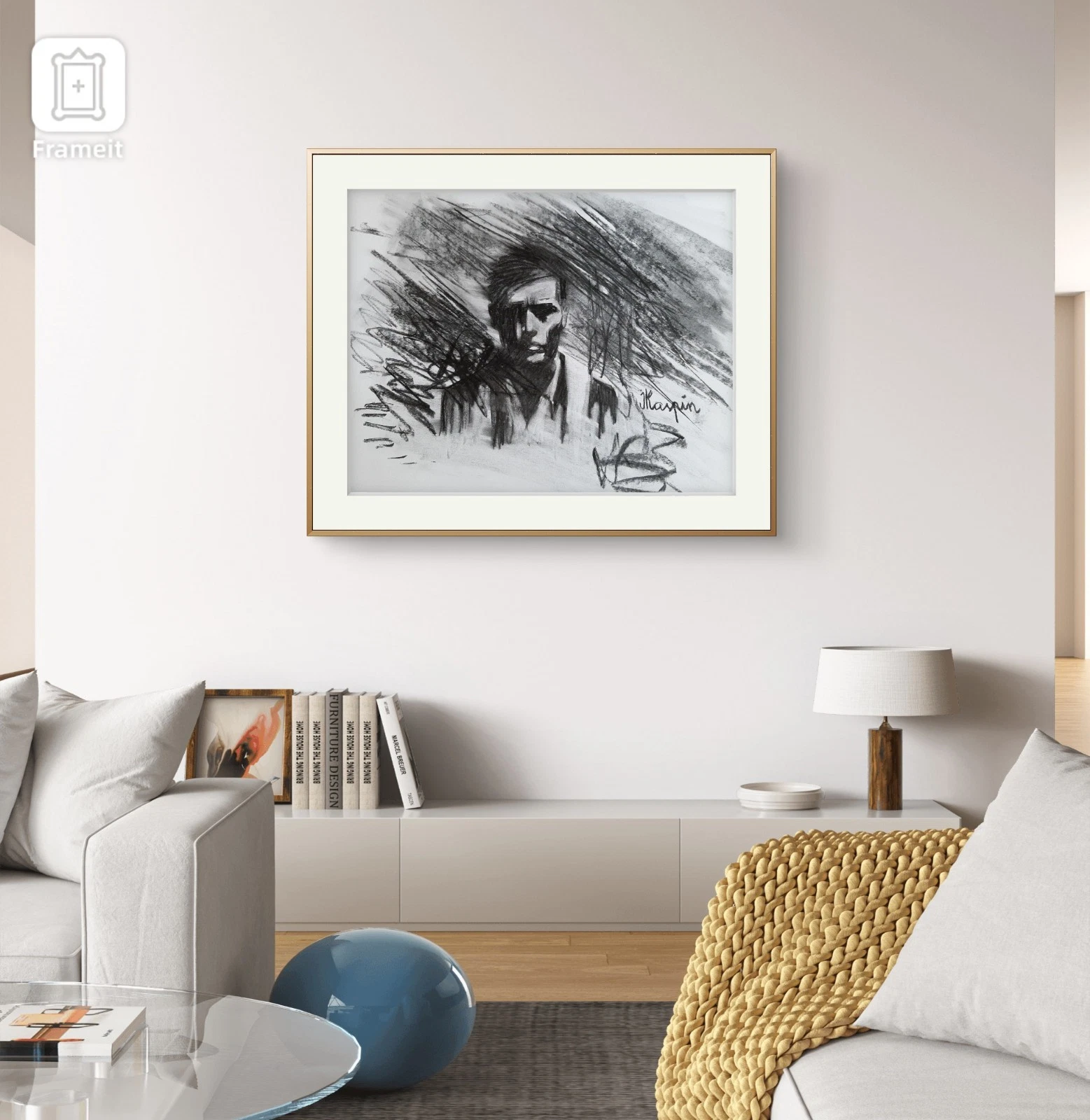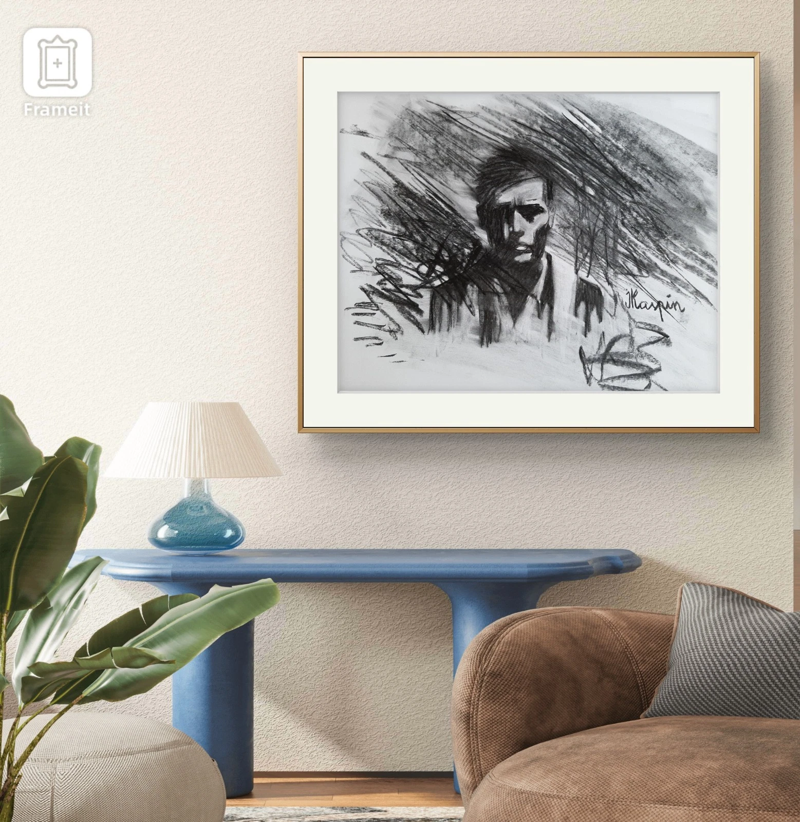 Jacques’s use of charcoal is visceral, almost violent. The background is a storm of gestural strokes and raw texture, evoking a psychological landscape more than a physical one. This is not a portrait in the traditional sense—it is a rupture. A space where the human form becomes a vessel for what cannot be said.