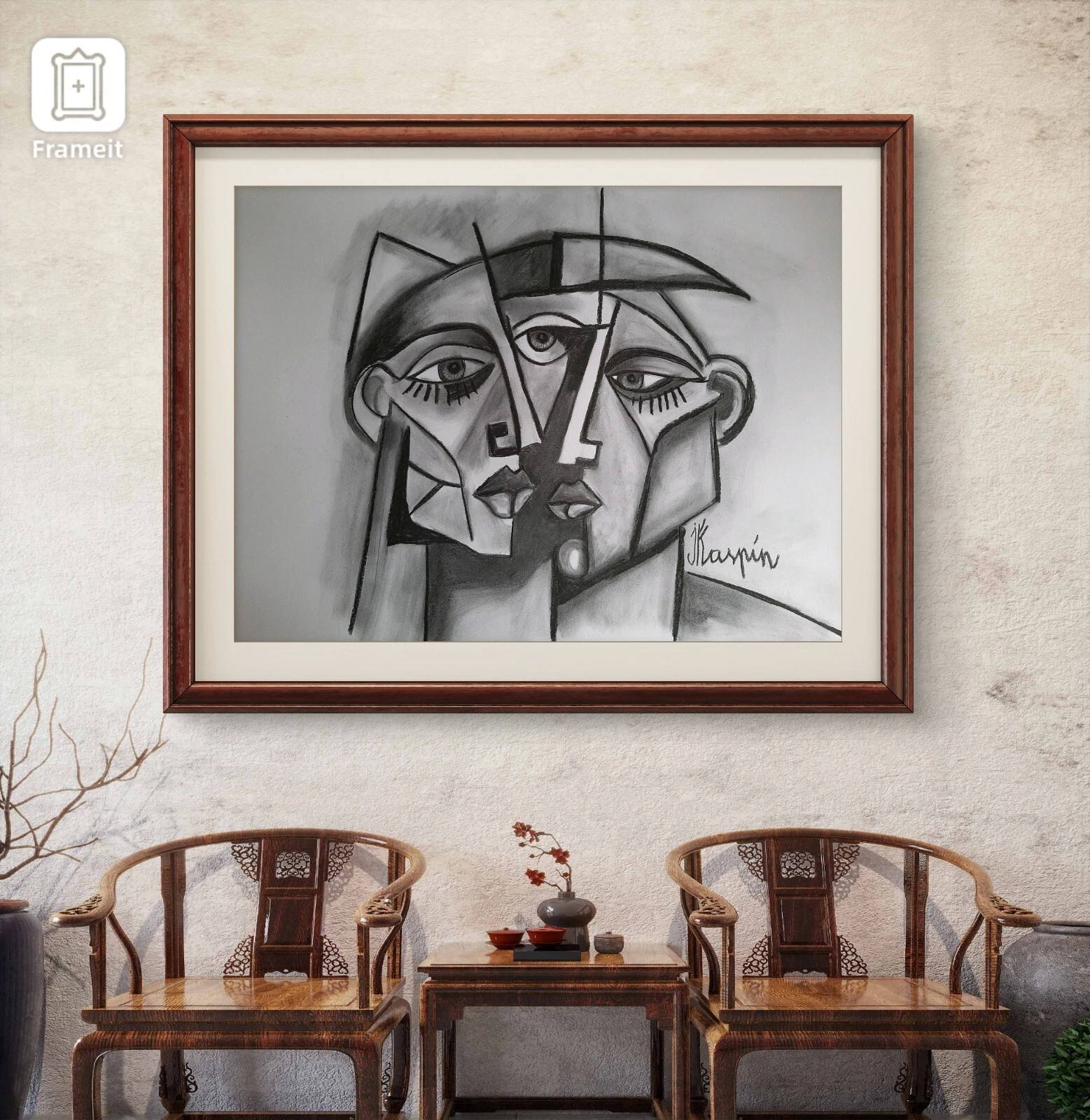 Ce regard central devient le point de bascule de l’œuvre — un symbole de conscience, de sensualité, et de mystère. Il incarne le lien invisible entre les deux visages, comme une pulsation commune, une danse intérieure. L’artiste joue avec les contrastes pour faire vibrer les émotions : le noir absorbe, le blanc révèle, et entre les deux, naît une tension poétique.