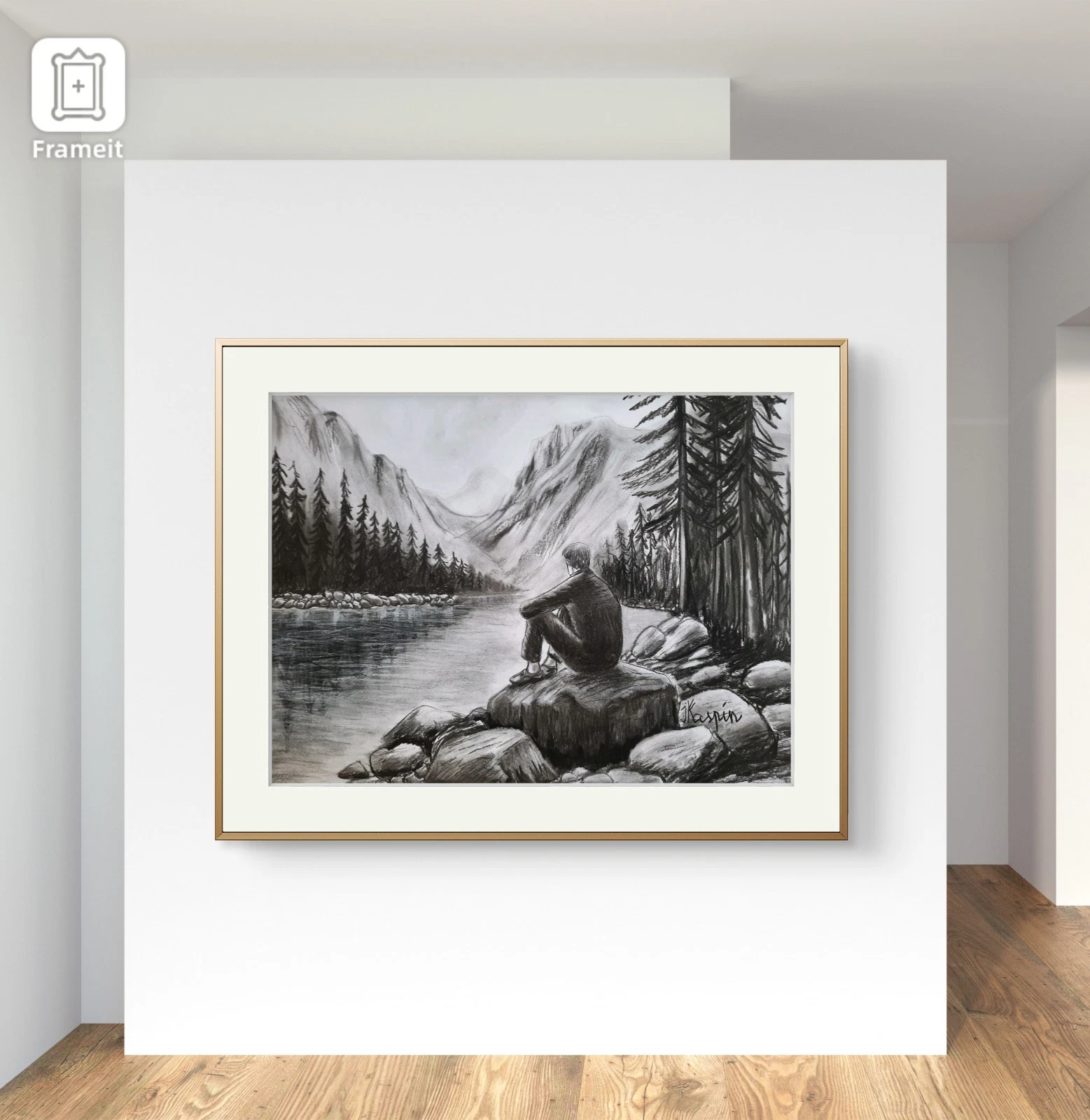 This drawing captures a moment suspended between solitude and serenity. A human figure, seated on a rock by the water’s edge, seems to entrust their thoughts to the river. The landscape, rendered in shades of grey, evokes a vast and silent nature: a forest of pines, distant mountains, and a veiled sky.