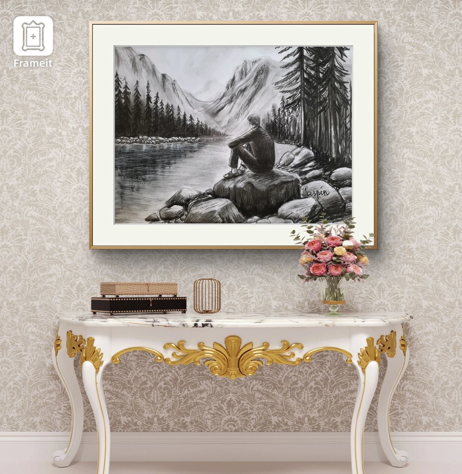 Ce dessin, capture un instant suspendu entre solitude et apaisement. Une silhouette humaine, assise sur un rocher au bord de l’eau, semble confier ses pensées à la rivière. Le paysage, dessiné en nuances de gris, évoque une nature vaste et silencieuse : une forêt de pins, des montagnes lointaines, un ciel voilé. Mais au-delà de la beauté du décor, c’est une émotion qui se dégage — celle d’un dialogue intime avec le monde. L’eau devient confidente, guide invisible qui emporte les soucis et les murmures intérieurs. Le spectateur est invité à ralentir, à écouter, à se laisser porter. Ce tableau est une invitation à la confiance : celle que l’on peut accorder à la nature, à l’instant, à soi-même. Il ne raconte pas une histoire, il en suggère mille. Il ne crie pas, il apaise.