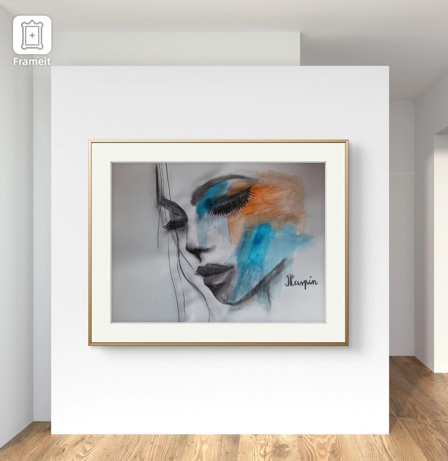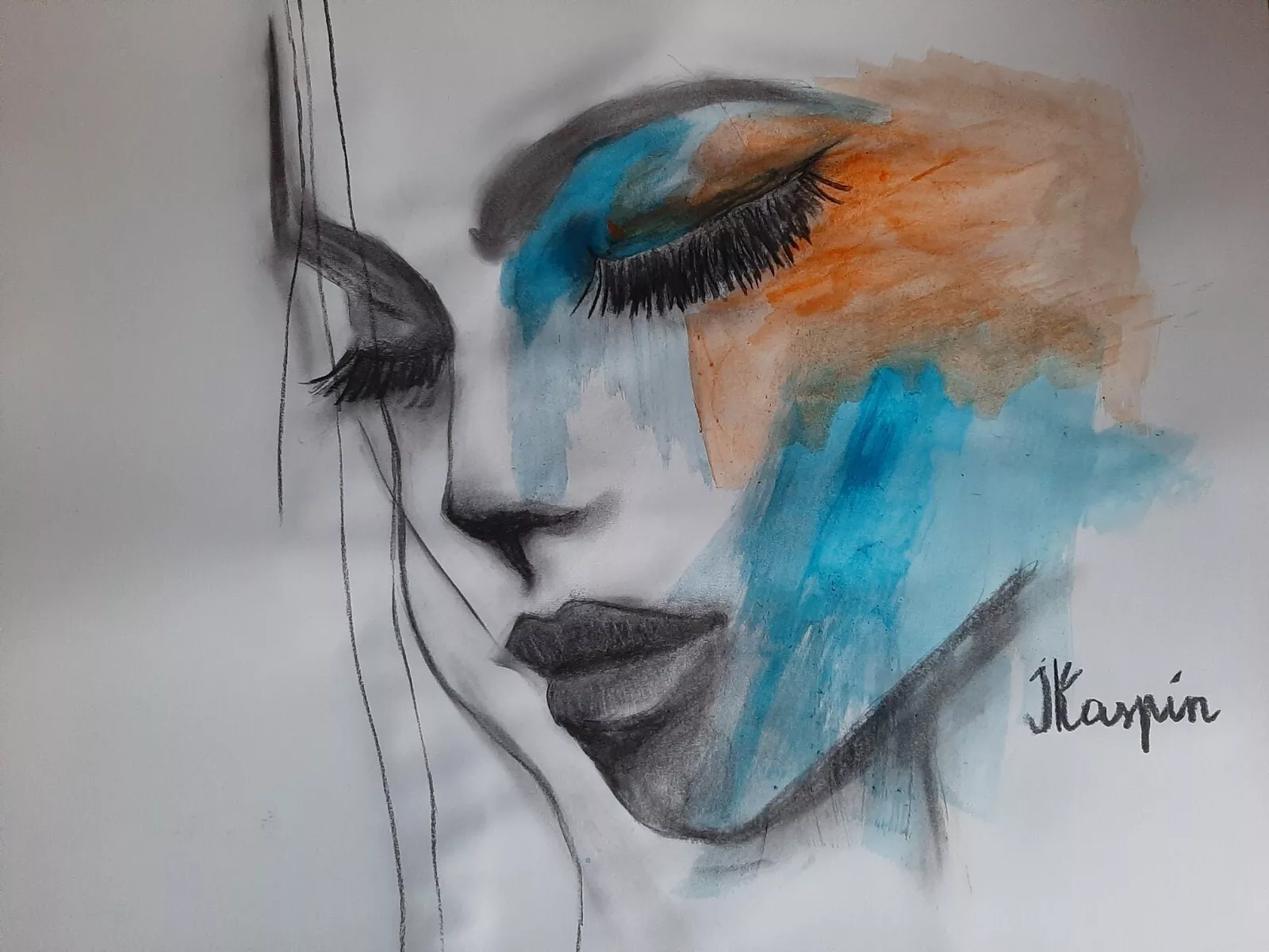 The grayscale rendering of the face is executed with surgical delicacy, yet it never feels clinical. Each line seems to carry the weight of a whispered emotion, a gesture remembered. Then, unexpectedly, vibrant strokes of blue and orange burst across the right side of the face—like emotion breaking through restraint. These colors do not illustrate; they embody. They are the echo of a moment, the trace of a tenderness once felt and never forgotten.