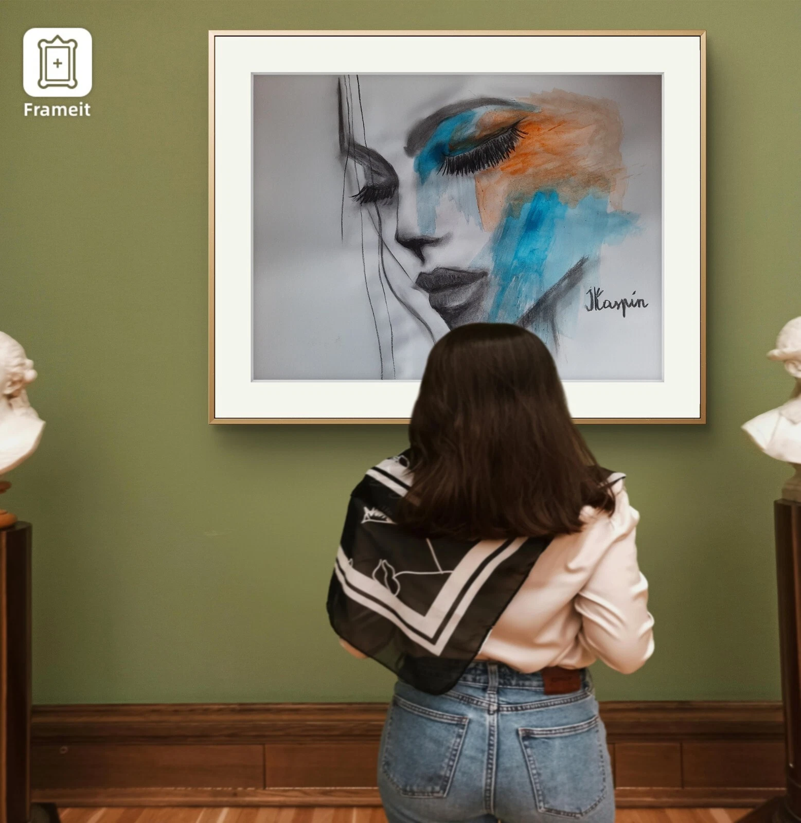Dans Une caresse oubliée, Kaspin Jacques nous offre une méditation visuelle d’une rare intensité émotionnelle. L’œuvre, à la croisée du dessin et de l’aquarelle, déploie le visage d’une femme en profil, les yeux clos, comme suspendue dans un instant de repli intérieur. Ce n’est pas un portrait au sens classique : c’est une empreinte, un souffle, une mémoire.