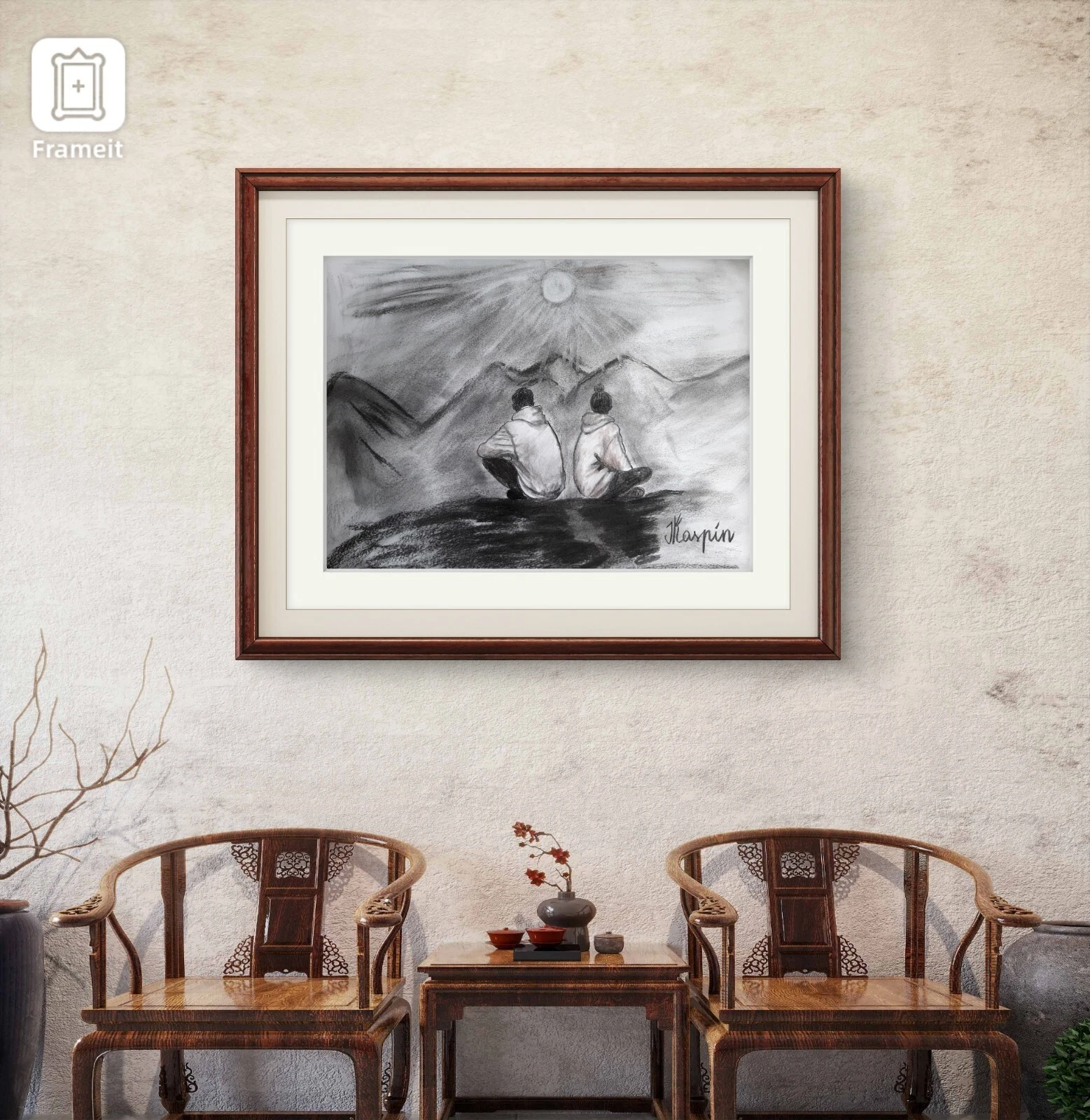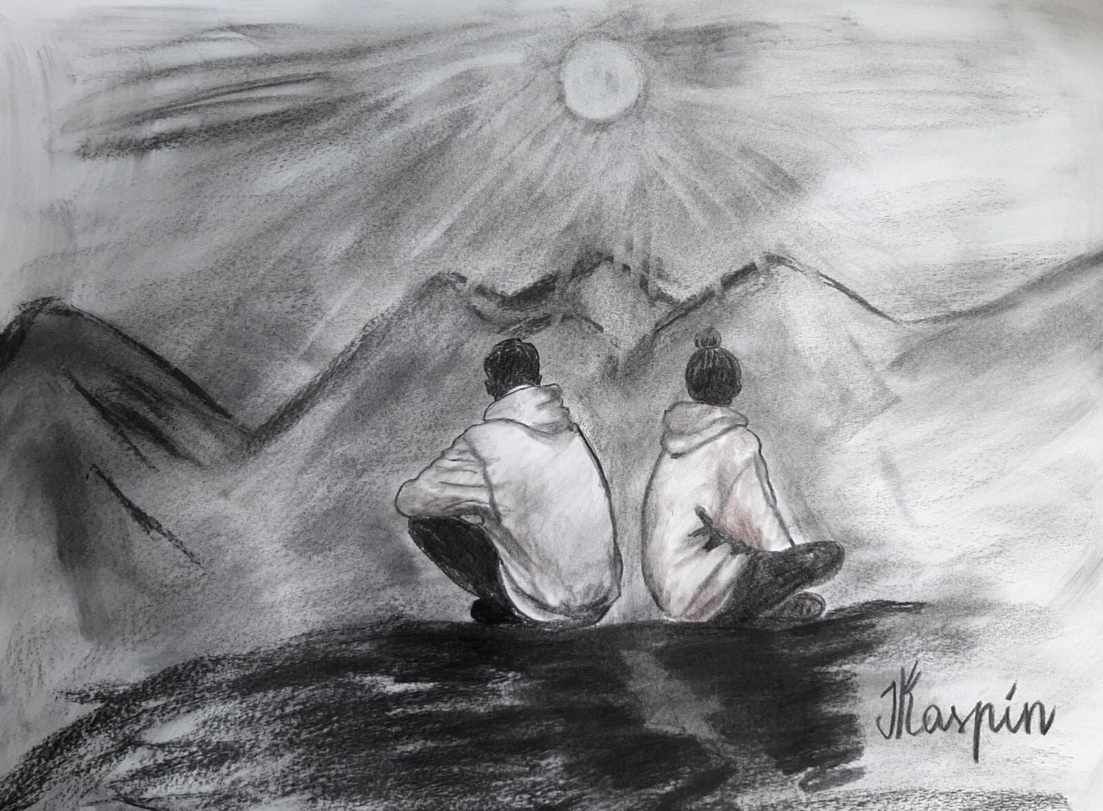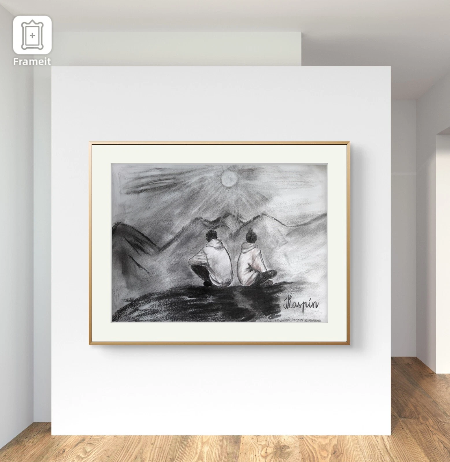 Assis côte à côte sur les rochers, deux silhouettes silencieuses contemplent l’horizon. Leurs capuches les enveloppent comme des cocons, gardant les pensées au chaud dans le souffle frais des hauteurs. Devant eux, les montagnes s’étendent, majestueuses et immobiles, comme si le monde retenait son souffle.